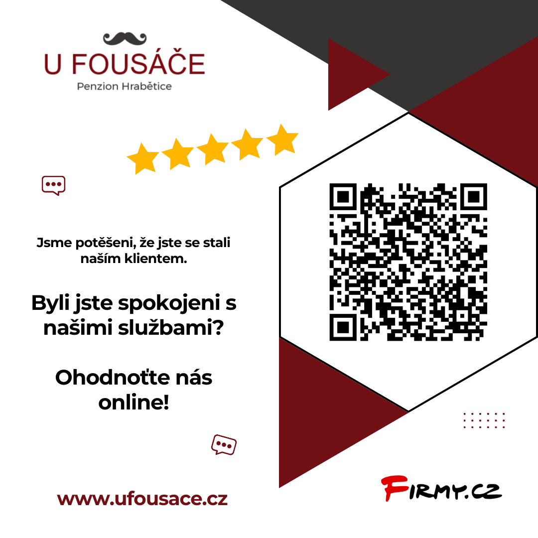 Těšíme se, že vás v ubytování U Fousáče přivítáme a poskytneme vám nezapomenutelný pobyt plný zábavy, relaxace a pohody. Vaše spokojenost je naší prioritou, a proto se budeme s láskou starat o každý detail vašeho pobytu.