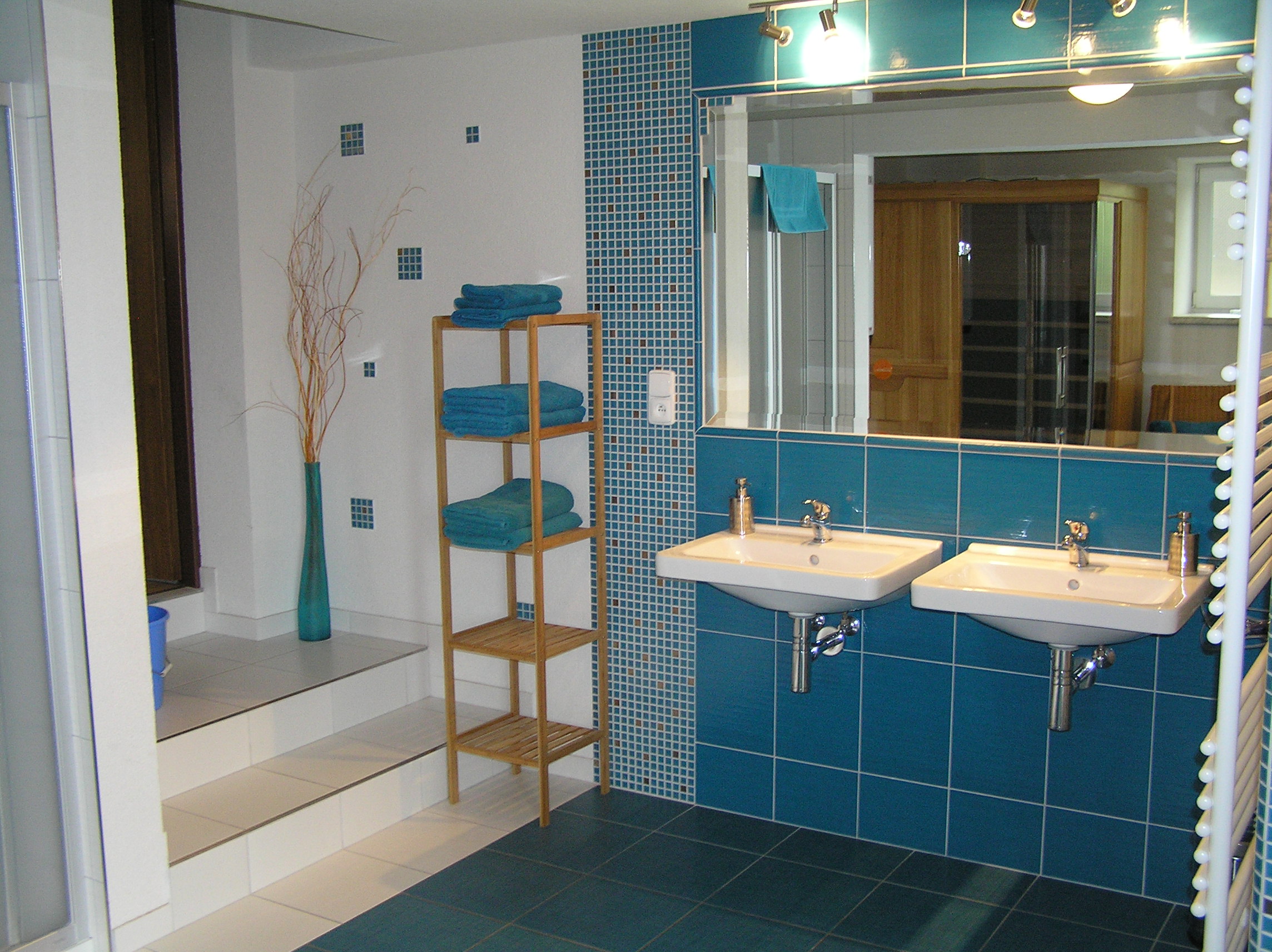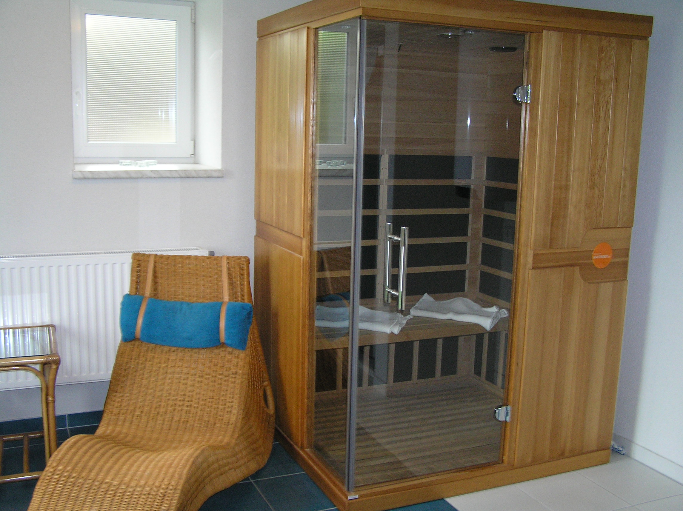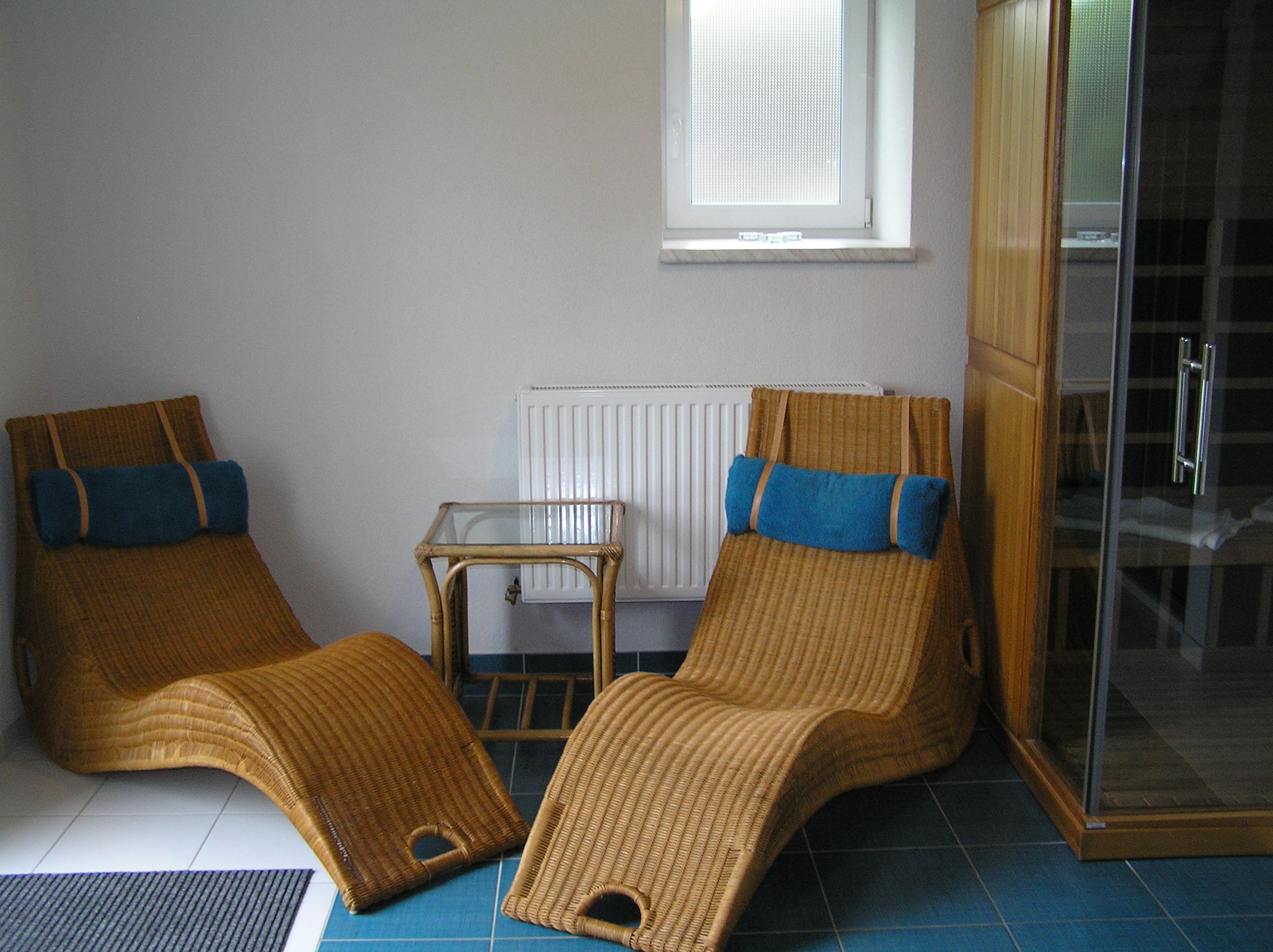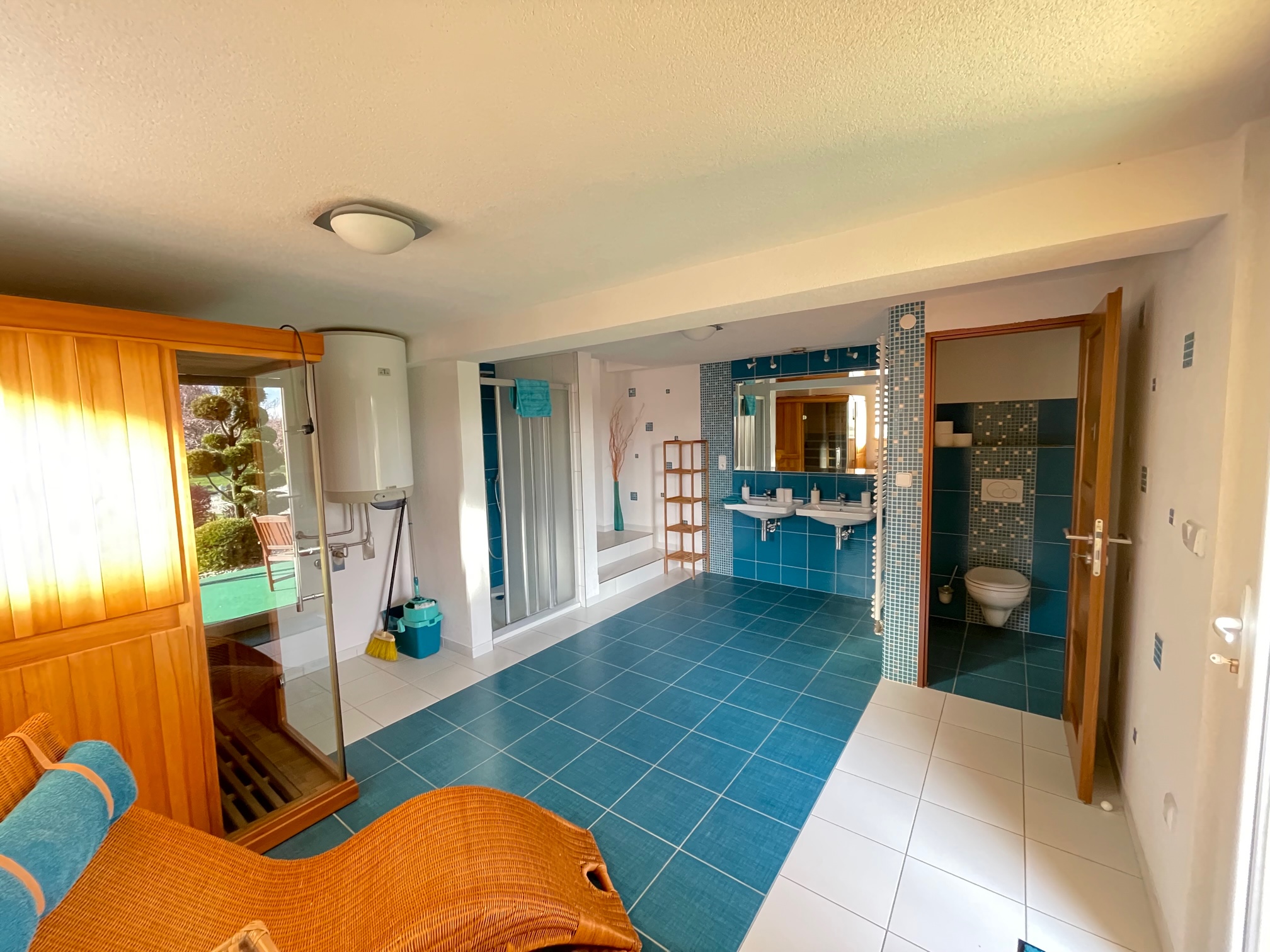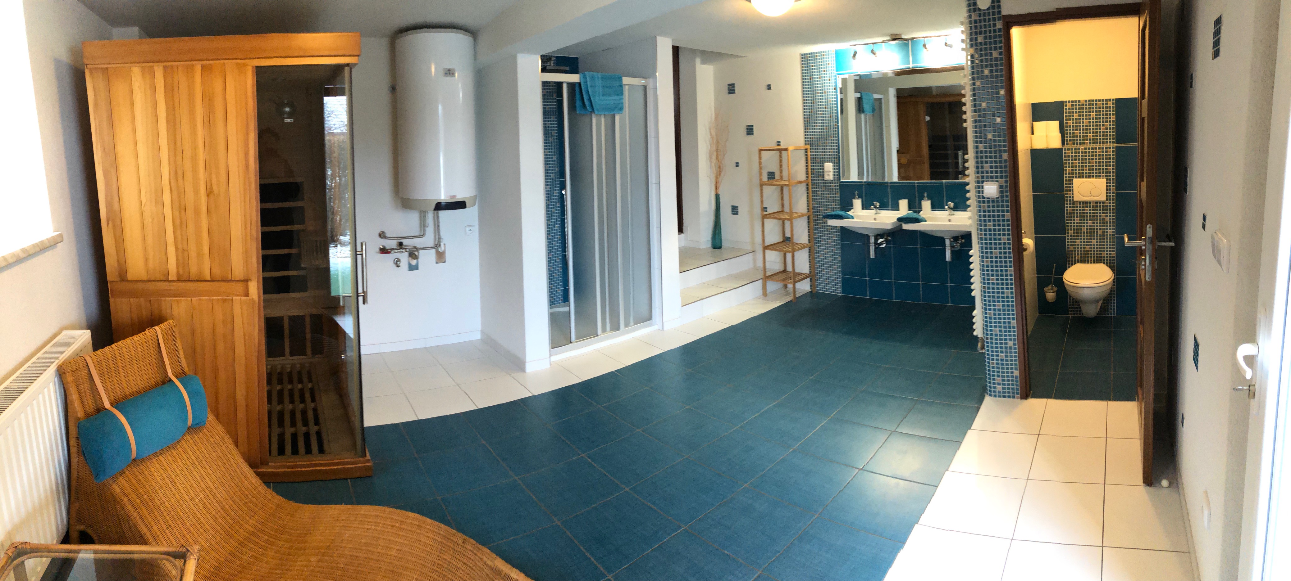 Koupelna se sprchovým koutem, dvěma umyvadly a samostatným WC, vysoušeč vlasů. Součástí koupelny je Infra sauna včetně odpočívacích lehátek.
