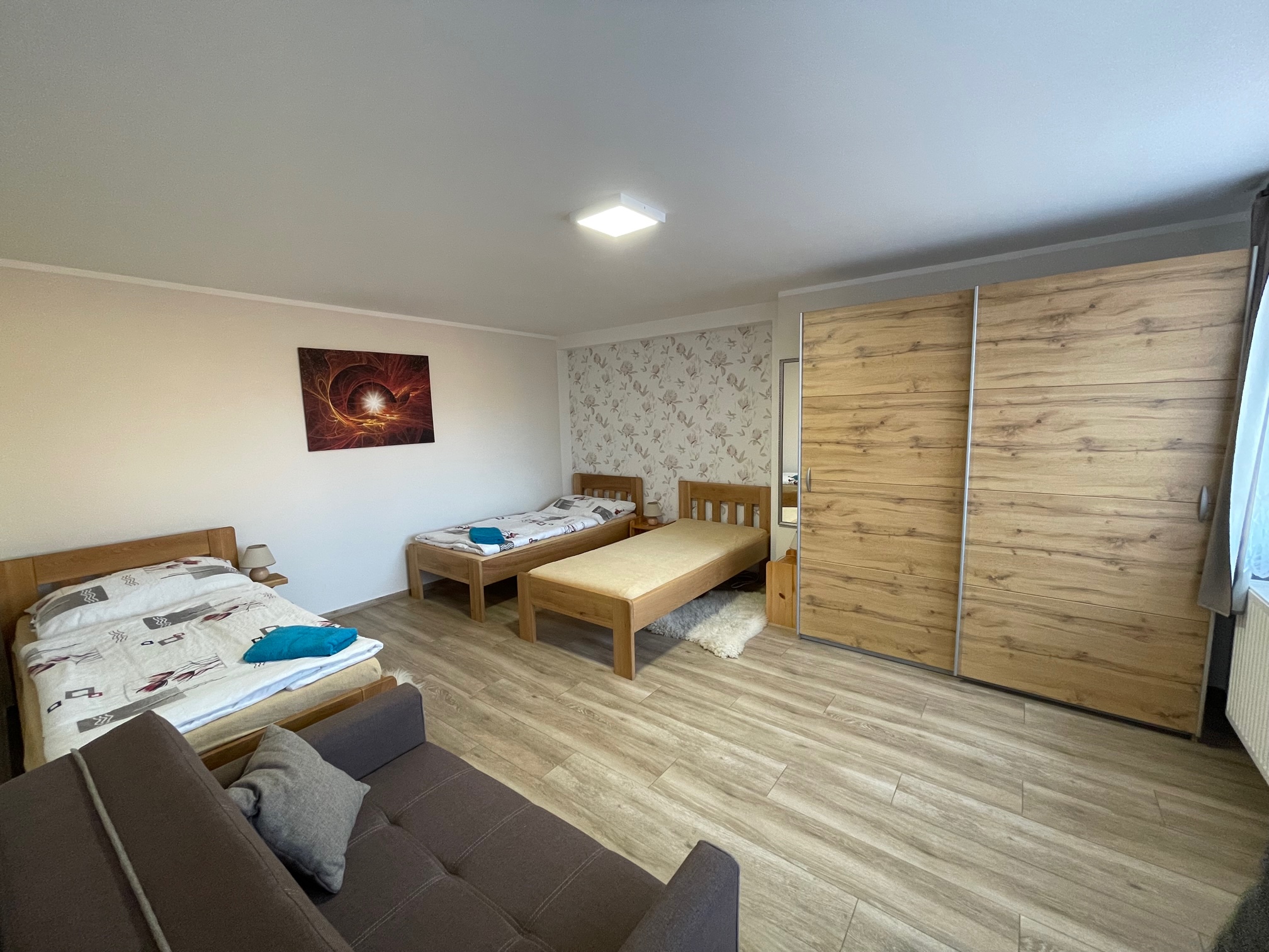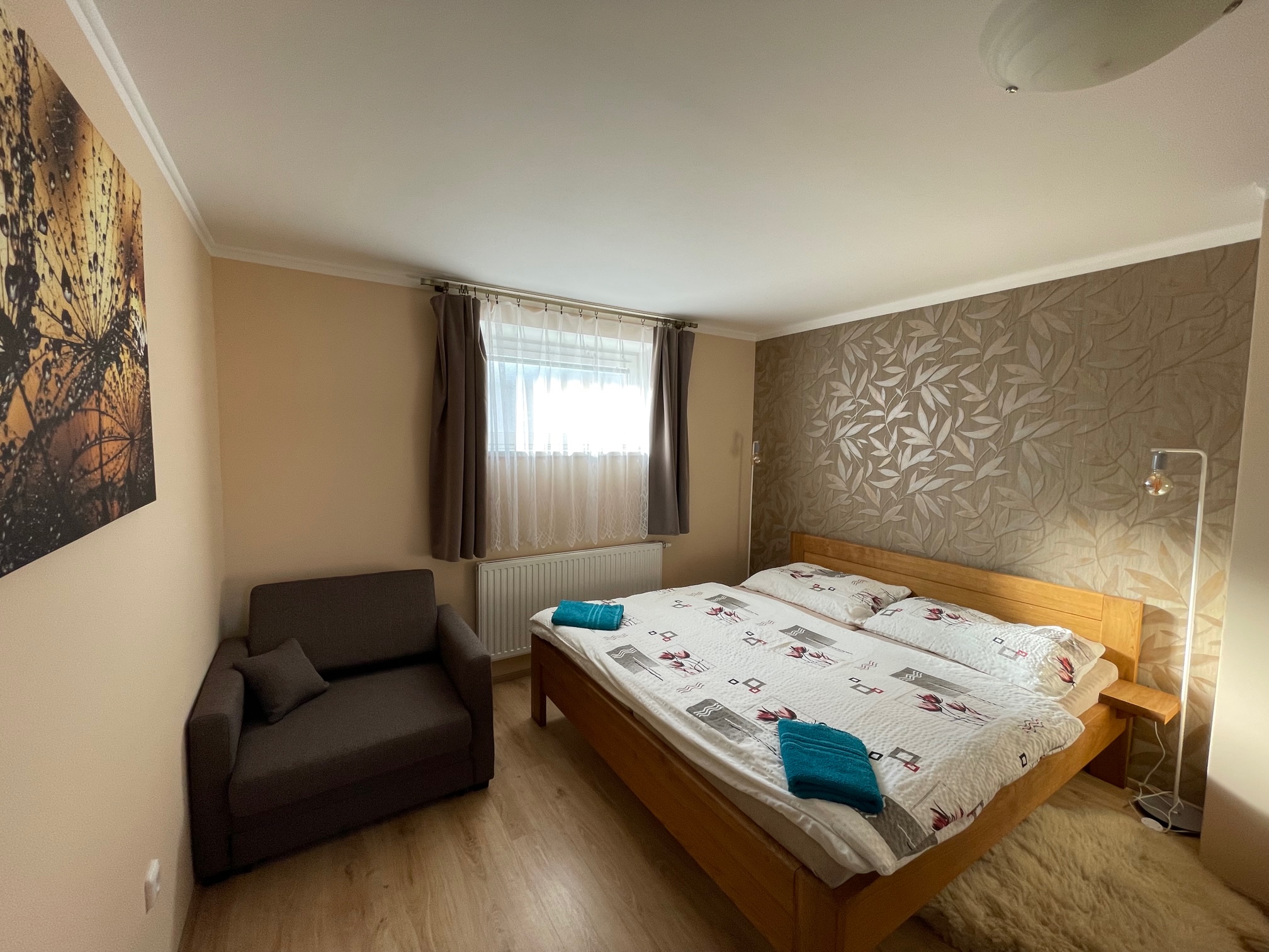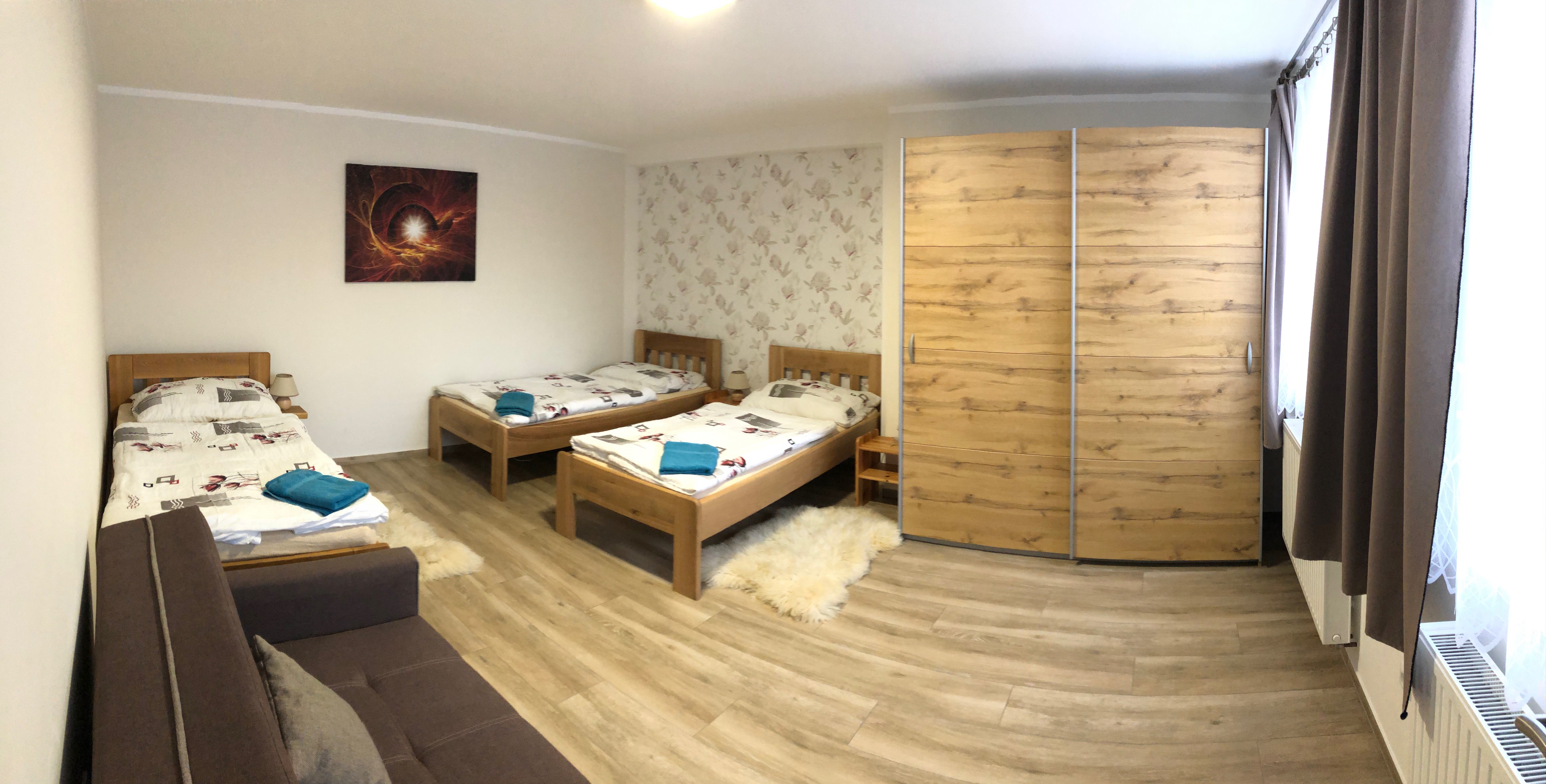 Apartmán se samostatným vchodem najdete v přízemí, má dvě ložnice - jedna ložnice se třemi lůžky a jedna ložnice se čtyřmi lůžky, obývací místnost spojenou s kuchyní, koupelnu a samostatné WC.