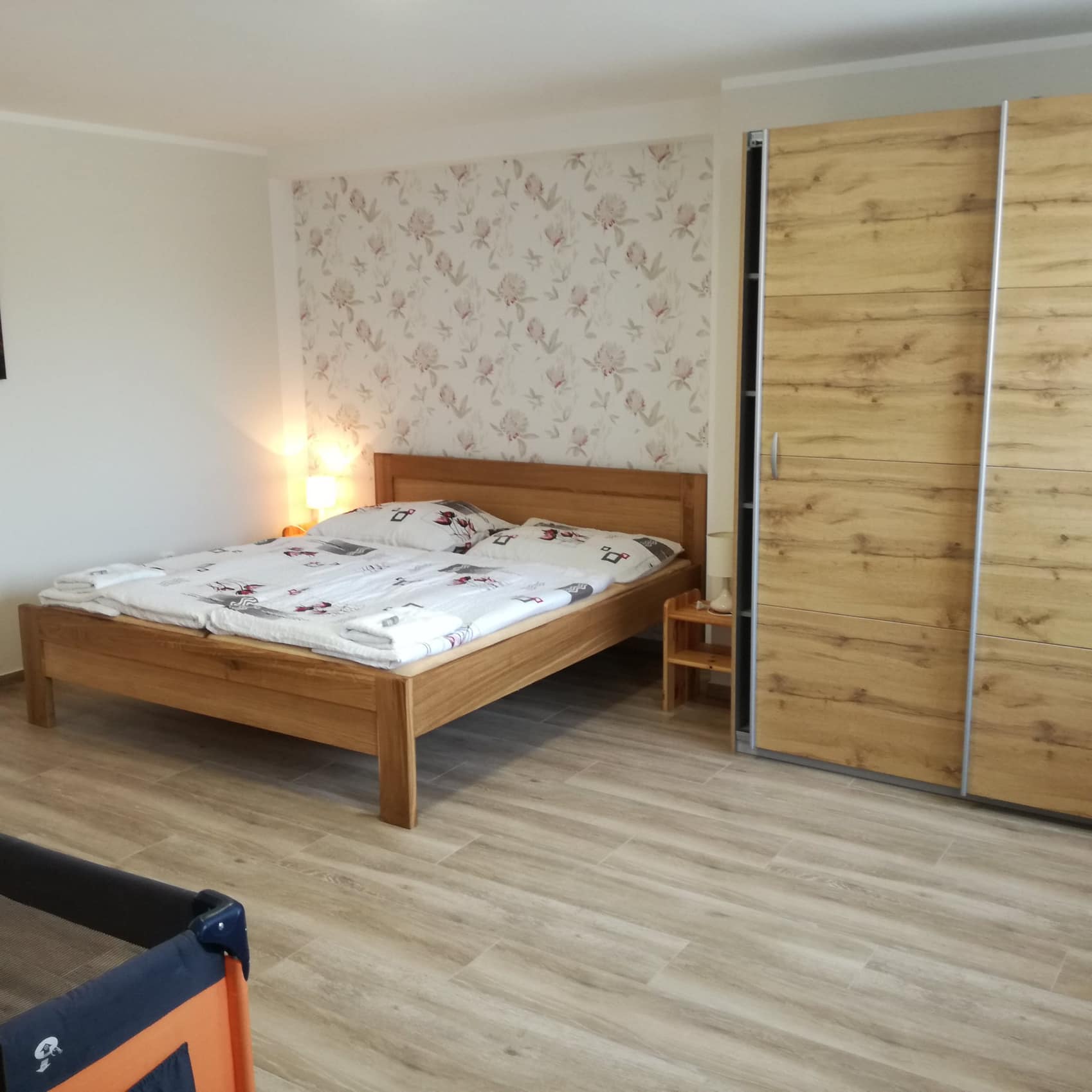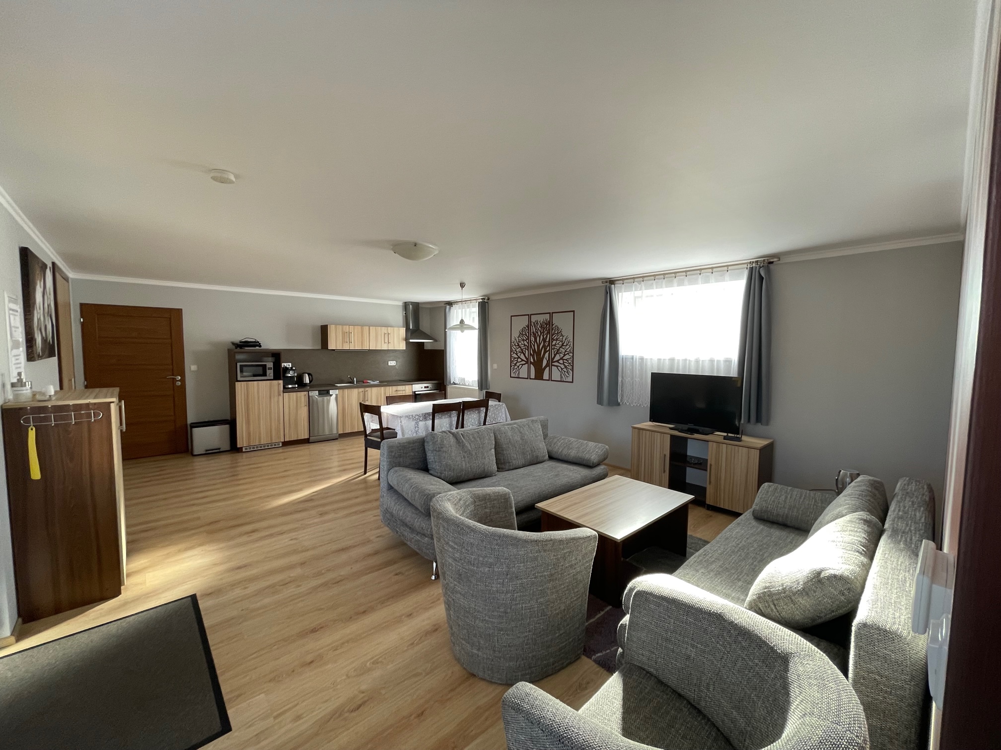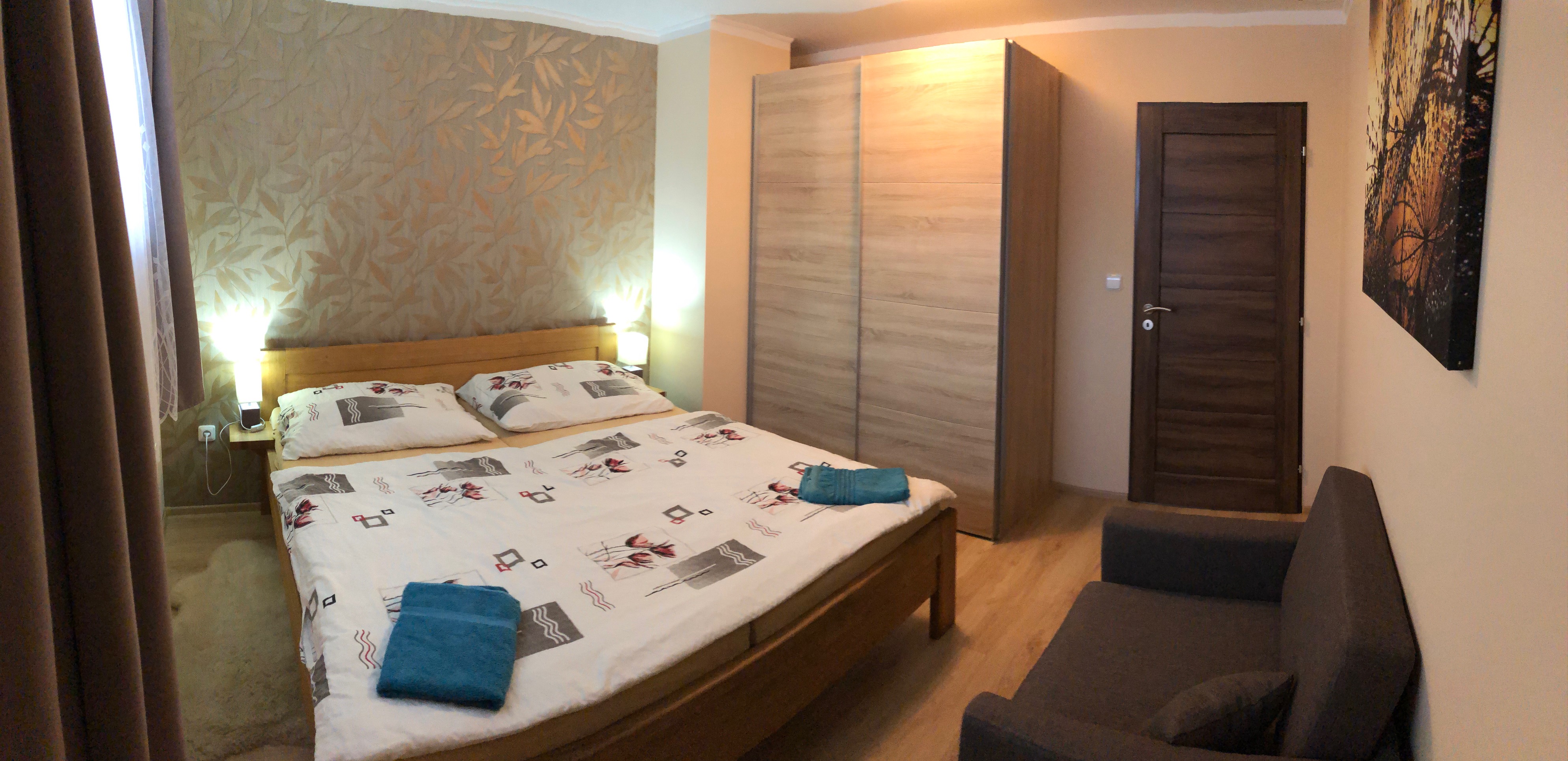 Apartmán se samostatným vchodem najdete v přízemí, má dvě ložnice - jedna ložnice se třemi lůžky a jedna ložnice se čtyřmi lůžky, obývací místnost spojenou s kuchyní, koupelnu a samostatné WC.