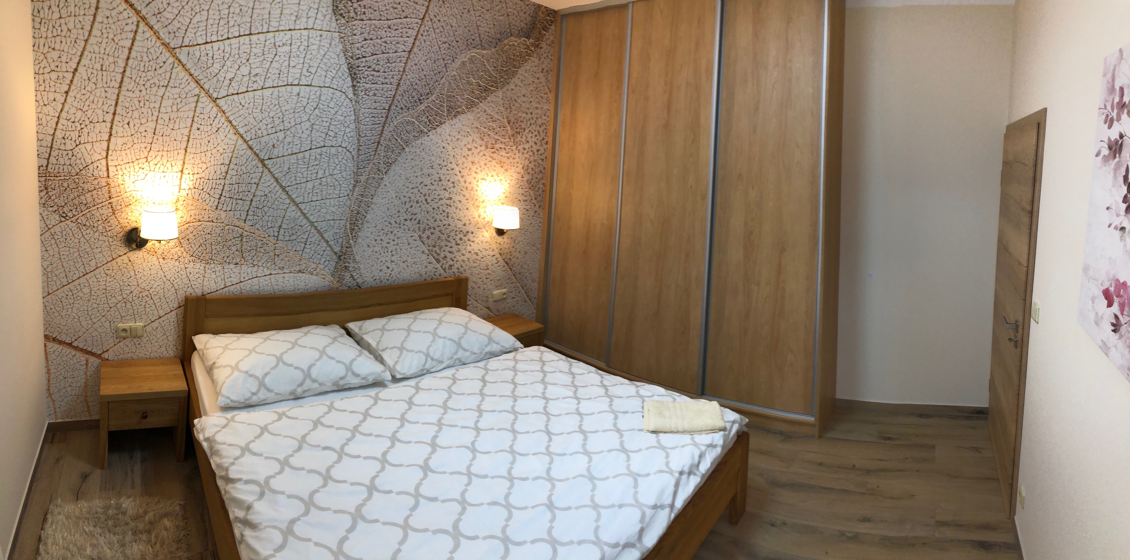 Tento apartmán se nachází v přízemí a má jednu ložnici pro dvě osoby s manželským lůžkem, obývací místnost s TV a vyklápěcí plnohodnotná lůžka (1x dvoulůžko a 1x jednolůžko), plně vybavená kuchyň oddělená od obýváku dveřmi. Součástí apartmánu jsou dvě koupelny.