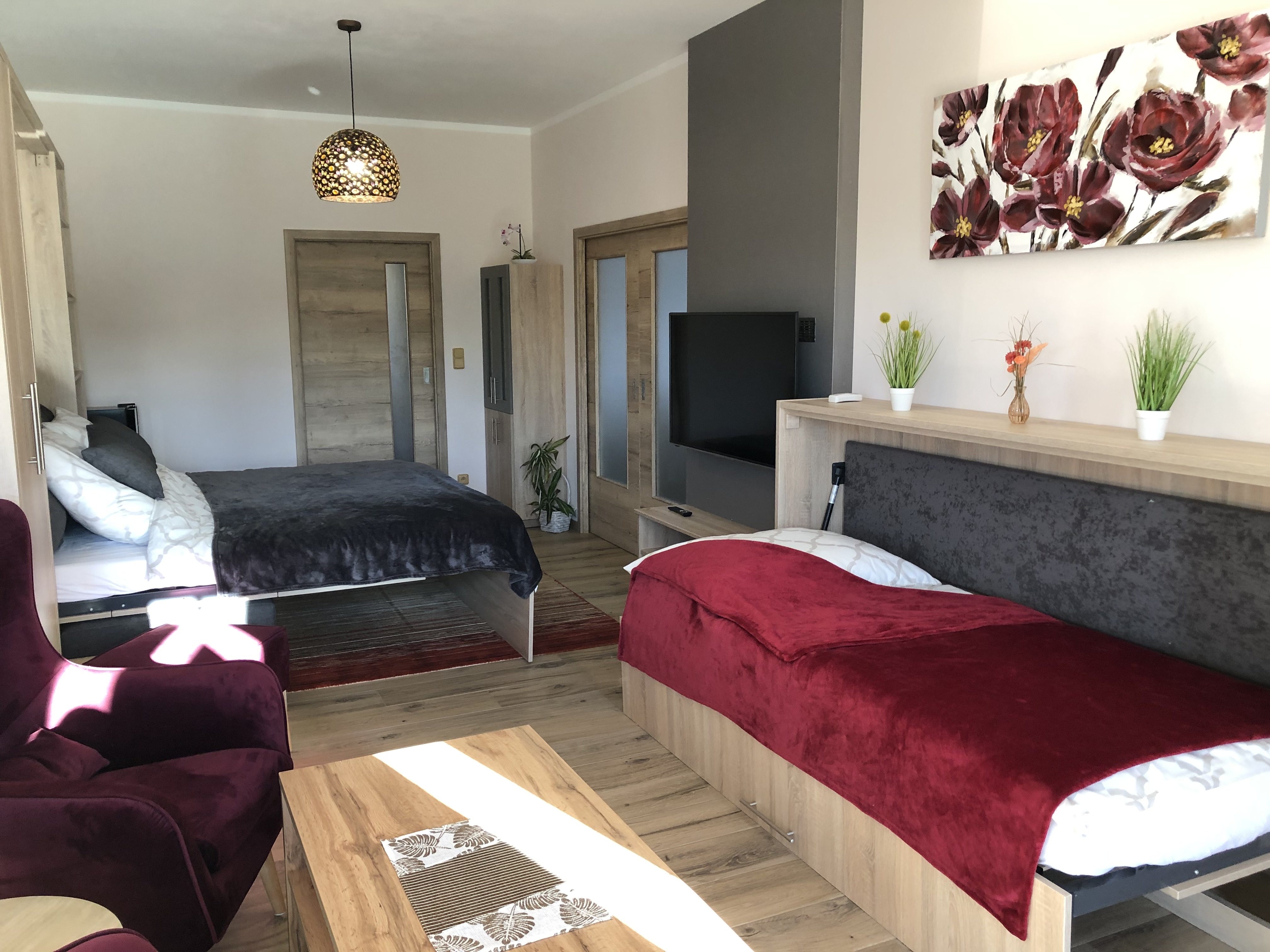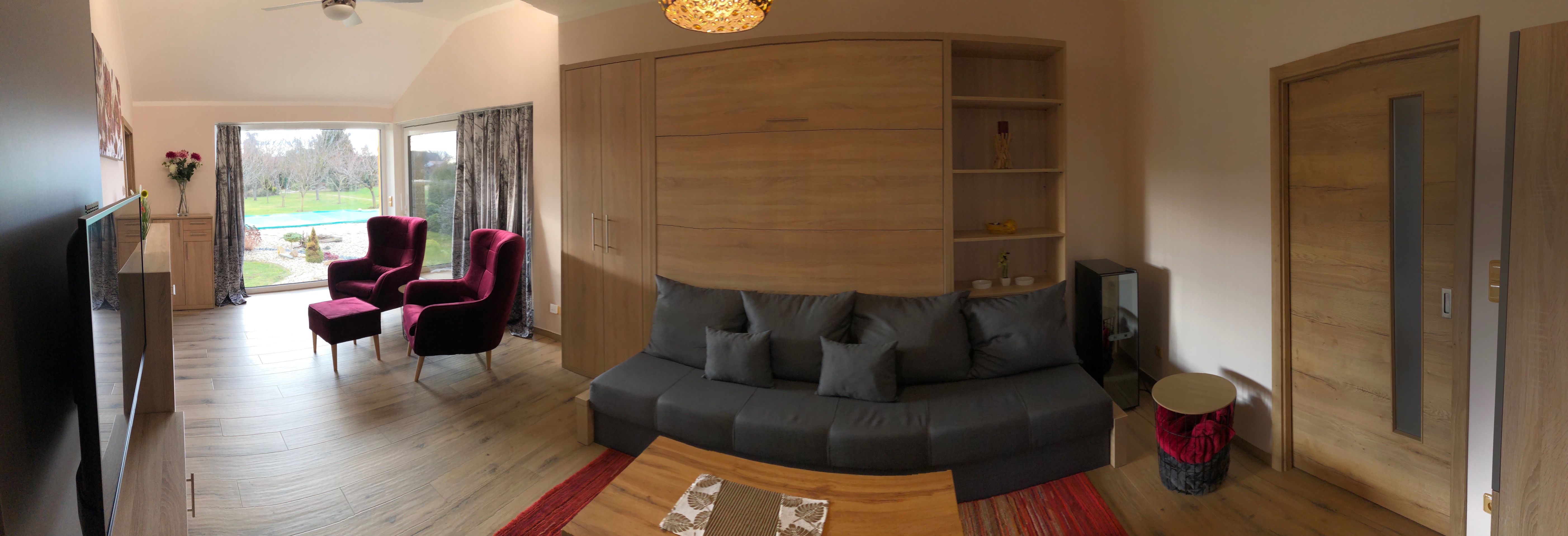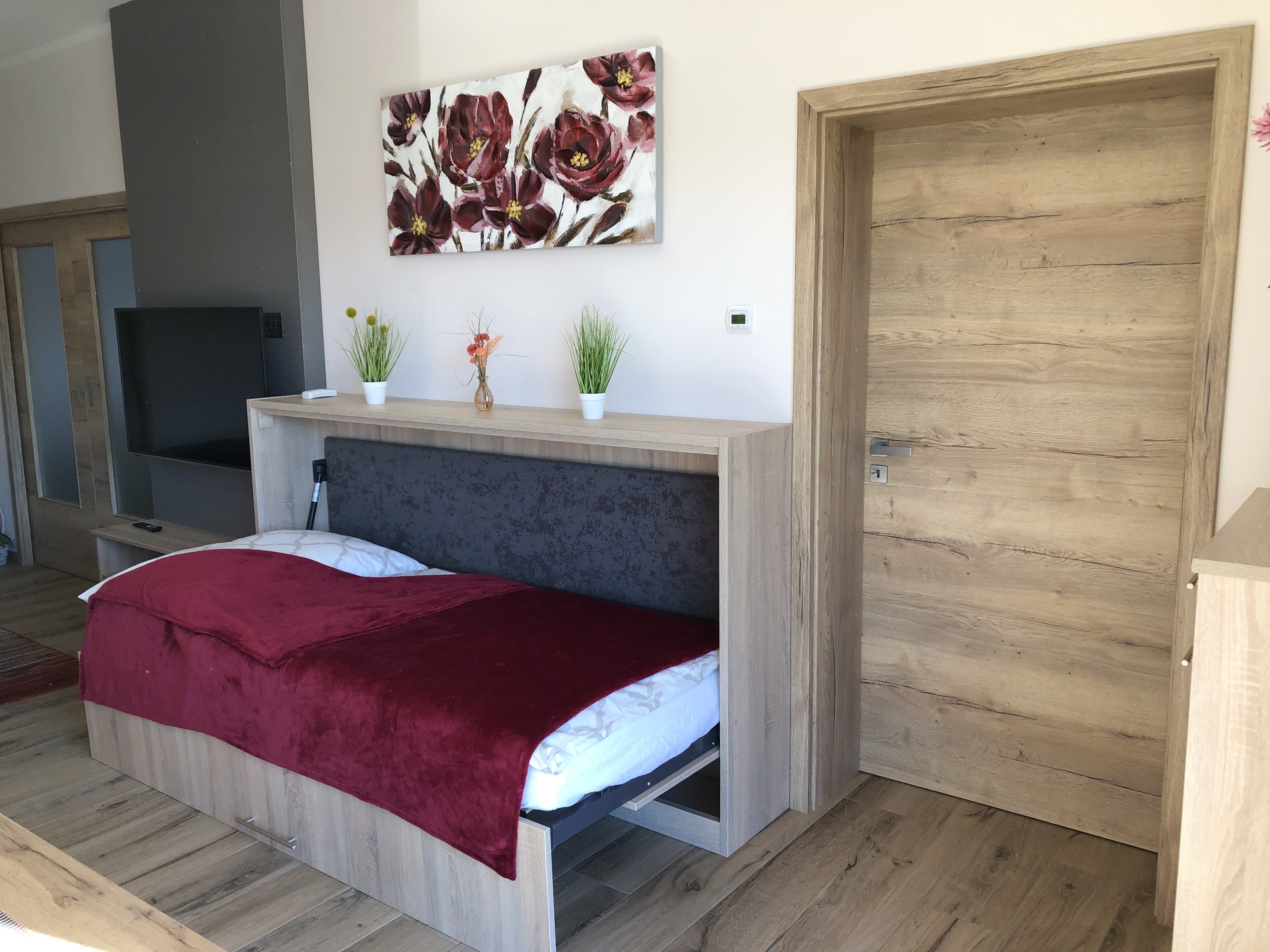 - Obývací pokoj 1x vyklápěcí plnohodnotné lůžko pro dvě osoby a 1x vyklápěcí plnohodnotné lůžko pro jednu osobu
