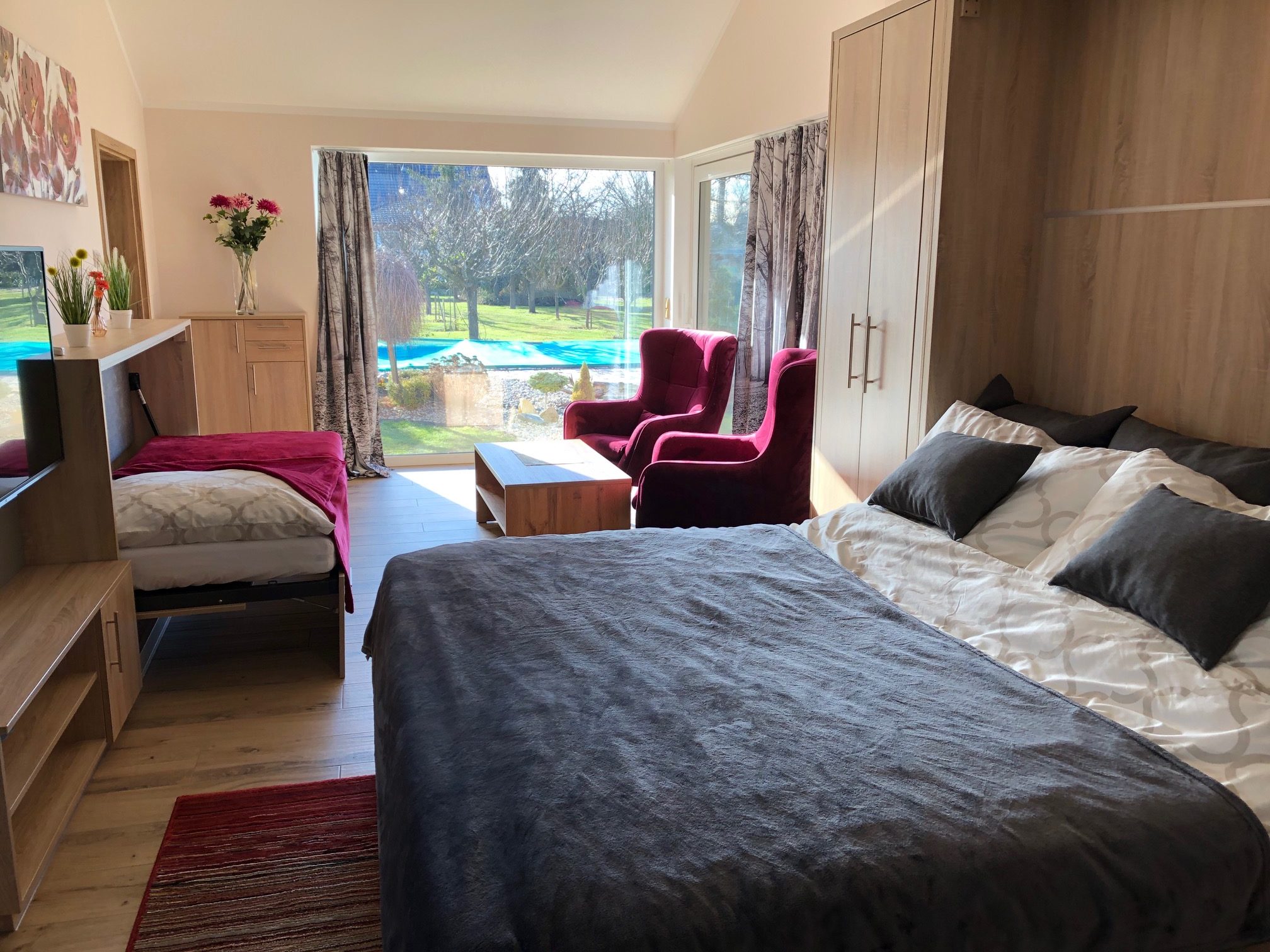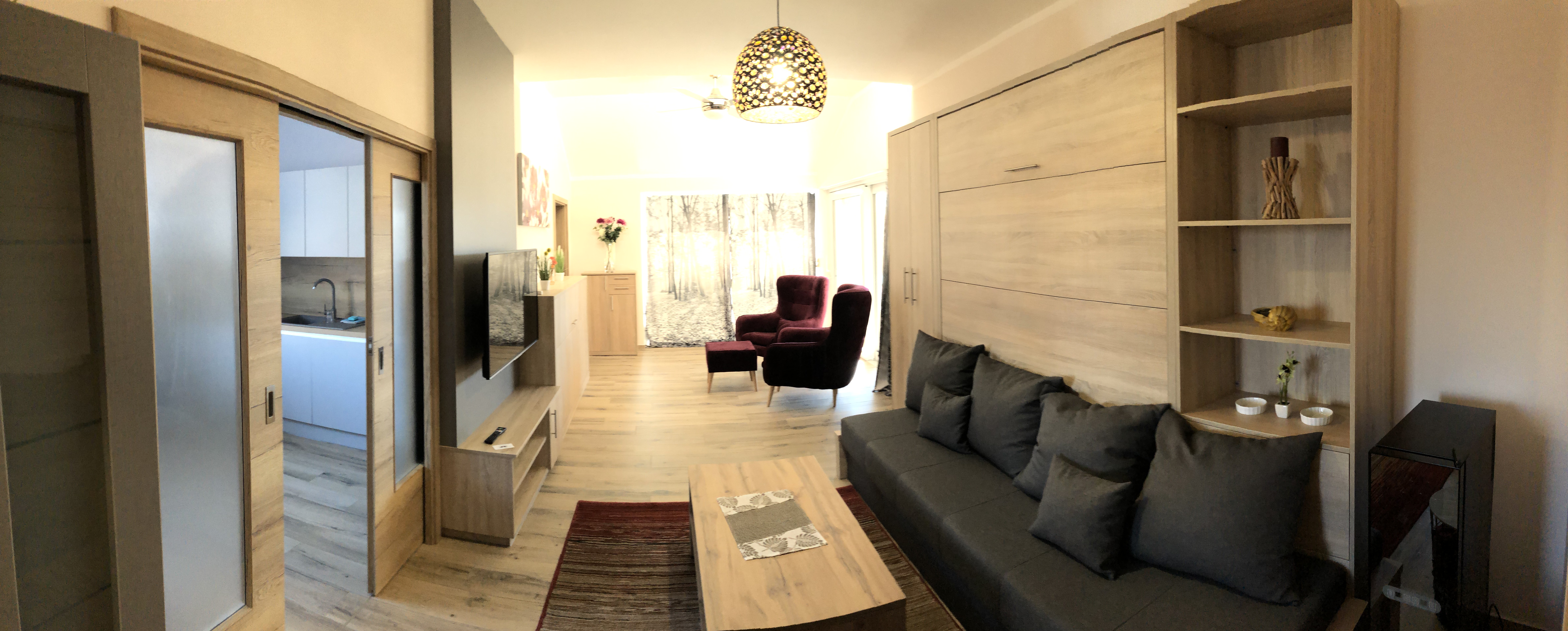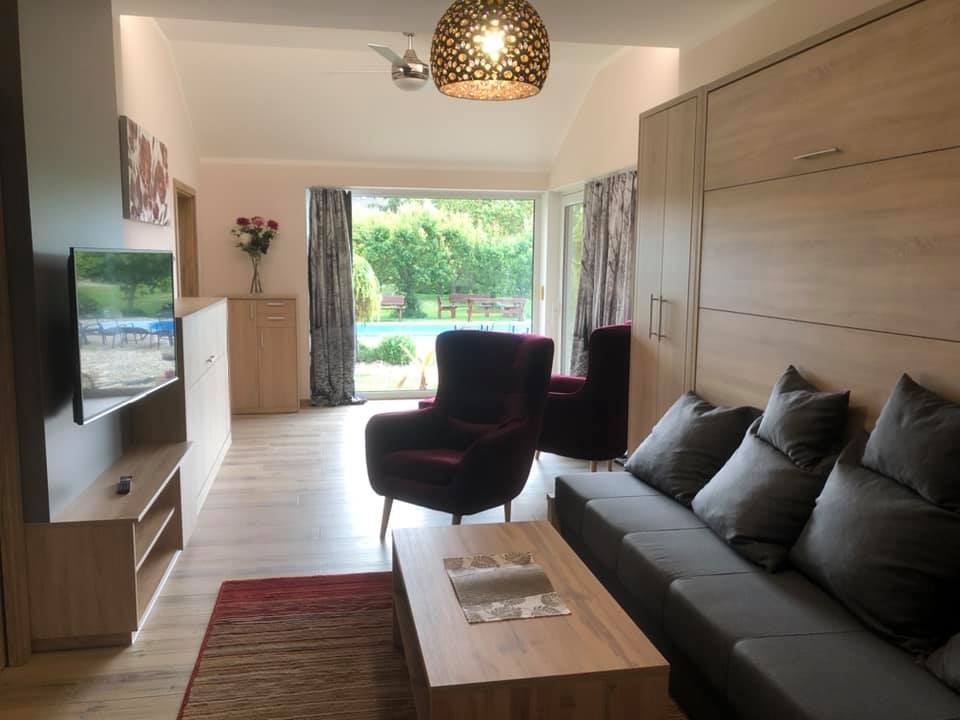 - Obývací pokoj 1x vyklápěcí plnohodnotné lůžko pro dvě osoby a 1x vyklápěcí plnohodnotné lůžko pro jednu osobu